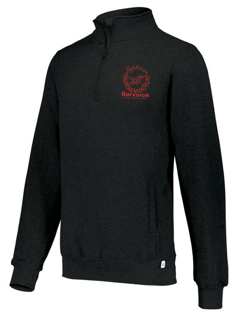 Quarter zip pullover style with reverse coil zipper and zipper garage